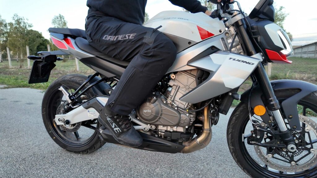 Generalno Tuono 457 ne zamara ni pri dužoj vožnji, dok je sedište relativno udobno za ovu kategoriju motocikla i pruža do oko sat i po vožnje bez pauze.