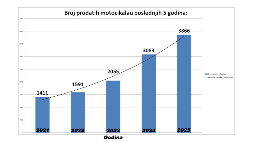 Tržište motocikala beleži porast prodaje novih vozila. 2024. godine prodato je ukupno 3.083 motocikala, dok se u 2025. godini taj broj popeo na 3.866 jedinica, što je porast od 20,26%.