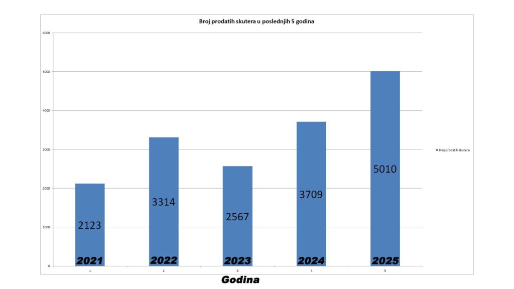 Kada je reč o broju prodatih skutera tu je porast još primetniji. Tokom 2024. godine prodato je 3.709 skutera, dok je u 2025. taj broj iznosio 5.010 primeraka, u procentima je to rast od 25,97%.