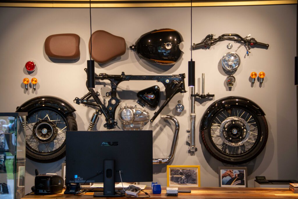 Za ljubitelje mehanike, na zidu se kao dekoracija nalaze glavne komponente jednog poptuno rastavljenog motocikla.