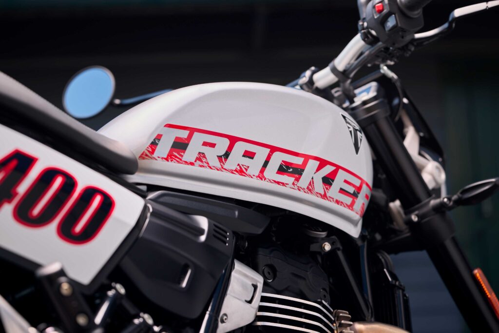 Tracker 400 za inspiraciju koristio je očigledno prave “flat track” motocikle. Osim izgleda, durgačije upravljača i položaja sedenja, od Thruxton-a ga odvaja ogibljenje za nijansu većeg hoda (140 mm hod napred) i gume sa izraženijim kramponima kao naglasak da je Tracker 400 previđen i za silazak sa asfalta.